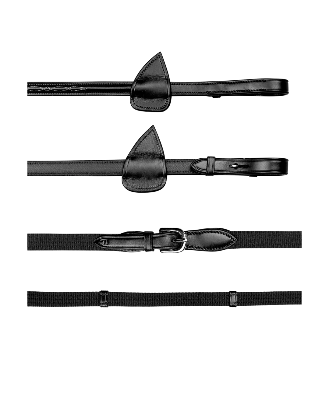 Leather and Web Reins with a beautifully embroidered pattern, designed to match a classic bridle. Made from Italian leather and equipped with stoppers.
